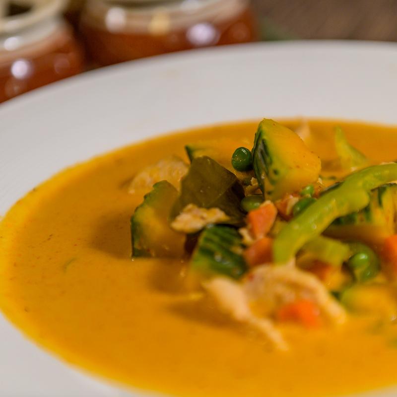 Green curry paste in coconut milk with avocado, bell peppers, peas, carrots and Thai basil.